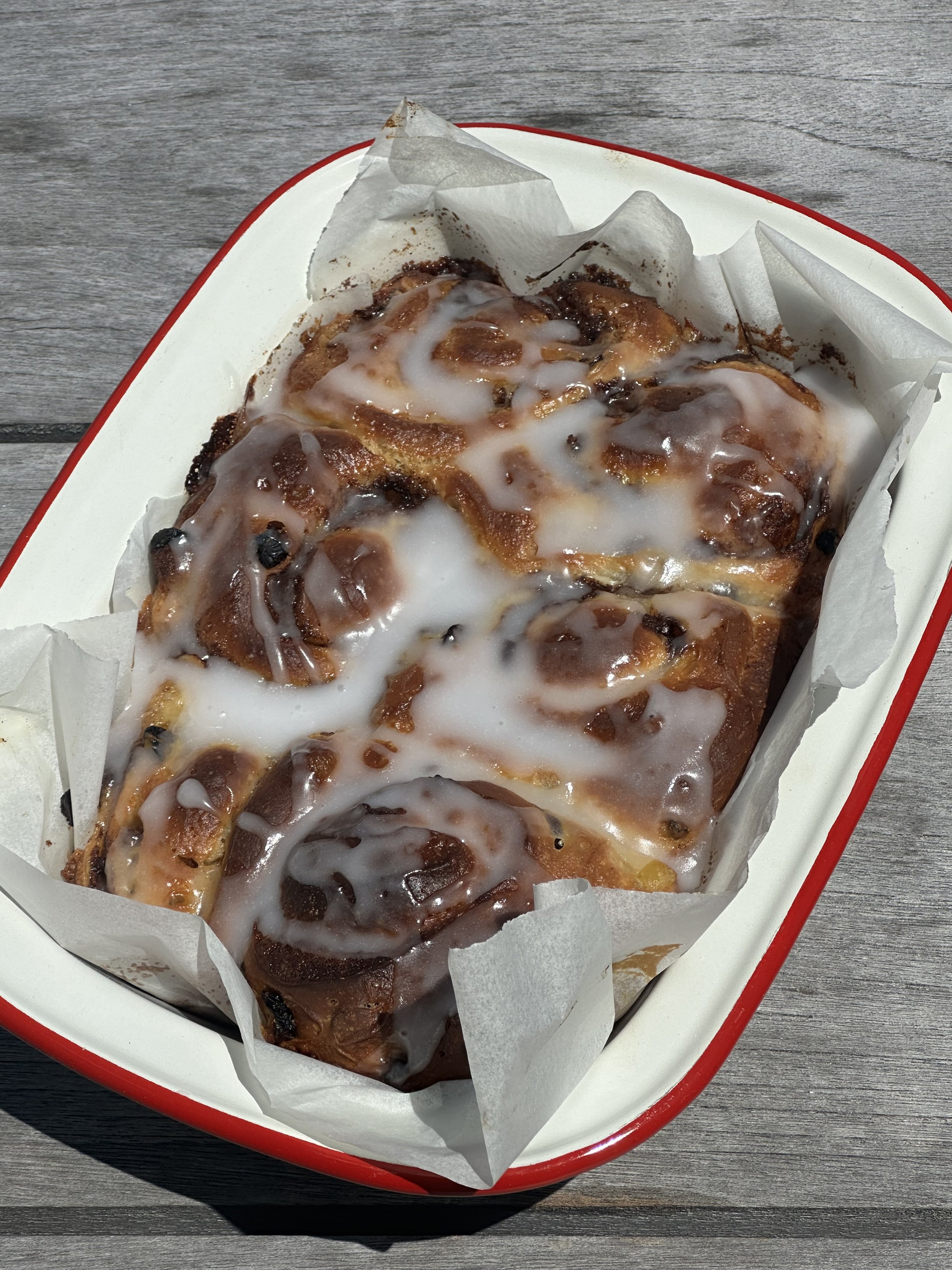 Note: the photo above is glazed with a simple icing sugar glaze made by mixing 1/2 cup sifted icing sugar with a few teaspoons of water to make it a thick pourable consistency. You make whichever you like! Also, this photo is for half the amount of buns. You could bake half and freeze half to bake another time.