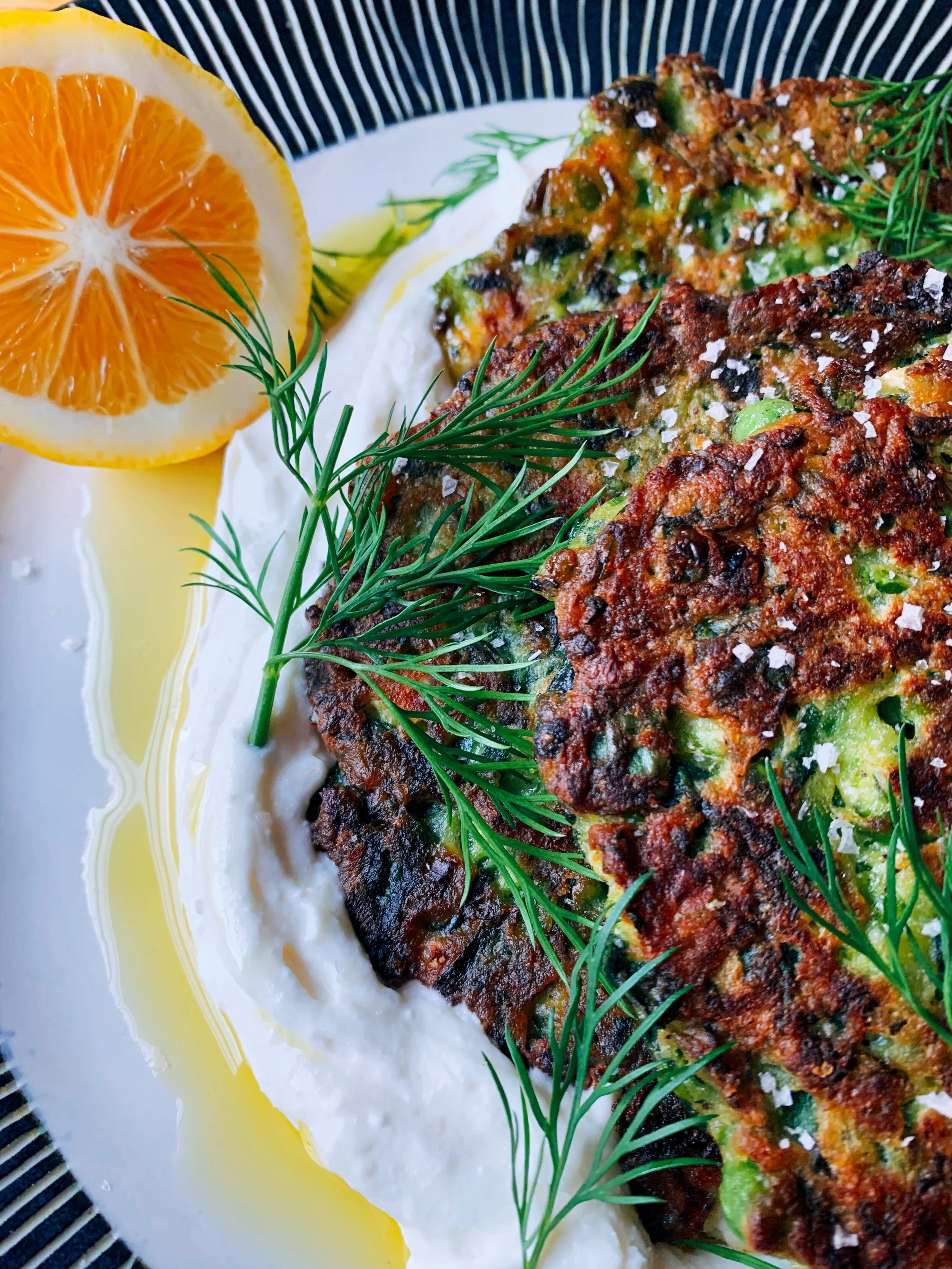 Green Pea and spinach fritters with preserved lemon and whipped ricotta